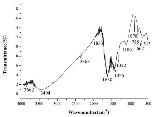 According to the FTIR spectra of banana-waste biochars (Figure 2), the following functional groups were present: OH alcohols appeared between 3500 and 3000 cm−1 (3404 cm−1) [15,16], C=O or C=C (1630 cm−1), C-H alkanes (1426 and 1322 cm−1), and C-O alcohols (1100 cm−1) derived from cellulose component of banana waste. Similar trends were found by Monir et al. [15,16]. Aromatic C-H out of bending vibrations (878 and 785 cm−1) associated with lignin was also detected. The peak at 1833 cm−1 is attributed to C-H stretching, whereas the peak at 2363 cm−1 corresponds to the alkyl C-H stretch. Phenol corresponds to the peak 3662 cm−1. On the same spectra, the peaks (662 and 515 cm−1) correspond to aromatic C-H bending functional groups [17].