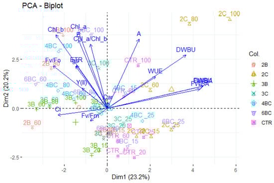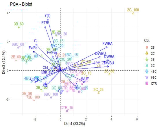 Hence, the PC2 and PC3 biplot, which explained 32.6% of the total variance (Figure 5) showed that all well-watered treatments had a higher fluorescence, chlorophyll pigment, and photosynthetic values, except for the control and the 2% biochar under 60% WHC (2B_60), compared to limited-water treatments, which had a low value.
