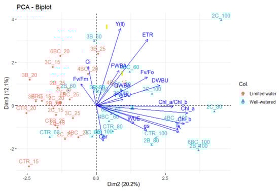 For the PC1 and PC3 biplot, which explained 35.4% of the total variance, it exhibited that the electron transport rate (ETR) and the effective photochemical quantum yield of PSII Y(II) were higher for deficit water treatments compared to well-watered treatments (Figure 4).