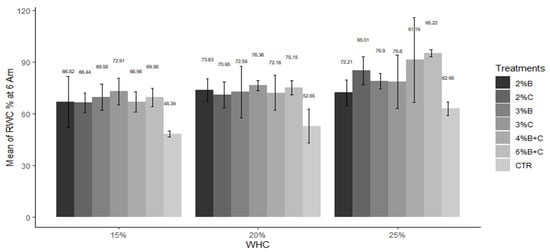 The highest mean of RWC at 6 am (95.22%) was recorded in 6% B + C at 25% WHC treatment, while the lowest (40.39%) was found at the control under 15% WHC treatment (Figure 6).