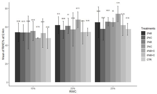 Concerning the RWC at midnight, the highest mean value (73.96%) was recorded in the 4% B + C treatment at 25% WHC in Figure 7.