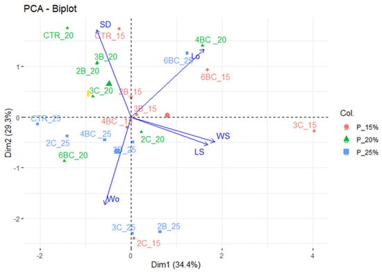 Biplot of the two first principal components showing the effect of the banana biochar on the leaf stomatal traits (SD: stomatal density, Lo: ostiole length, WS: width of stomata, LS: length of stomata, Wo: width of ostiole affected based on the three proportion) (15, 20, and 25% of WHC capacity).