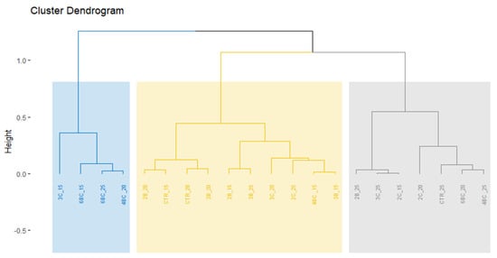 Accordingly, the hierarchical clustering distinguished three groups of treatments. It highlighted the overall performance of the treatments obtained by analyzing the stomatal traits’ data (Figure 9). The first group contained four treatments (3C_15, 6BC_15, 6BC_25, and 4BC_20): 97% of dry soil mixed with 3% compost at 15% of WHC, 3% compost plus 3% of banana-waste biochar added to 94% of dry soil at 15% of WHC, 94% of dry soil mixed with 3% of compost, 3% of banana-waste biochar at 25%, 2% of compost, 2% of banana waste added to 96% of dry soil at 20% of WHC had the highest values of Lo, WS, and LS, respectively. The second group (2B_20, CTR_15, CTR_20, 3B_20, 2B_15, 3B_25, 3C_20, 2C_25, 4BC_15, and 3B_15) contained treatments amended with biochar or compost as a singular application or unamended treatments (CTR: control that is only 100% of dry soil). All those ten treatments revealed a high value of stomatal density even under drought. The third group (2B_25, 3C_25, 2C_15, 2C_20, CTR_25, 6BC_20, and 4BC_25) had the greater values of ostiole width.