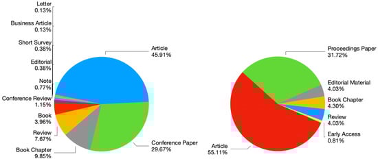 Ensuring a high degree of accuracy for our mapping involved resorting to filtering the articles from the list of those obtained in the previous stage. Consequently, at this stage, we filtered the articles that had been obtained in order to provide a high degree of accuracy to our mapping. The previous queries generated results that covered a wide spectrum, such as articles, proceedings papers or conference papers, conference reviews, editorials, notes, letters, business articles, books, book chapters, reviews, short surveys, and early access articles. In accordance with the structures related to the types of scientific papers, in corroboration with our aim to include in our research the aspects directly related to the research results, we refined the results obtained in the previous stage to the papers of the article and proceedings paper or conference paper type. Therefore, the structure of the results according to the type of documents is presented in Figure 2, with 86.83% of the WoS database results represented by articles and proceedings papers and 75.58% of the results of the Scopus database illustrated by articles and conference papers. In addition, we filtered the results from this refining stage according to the language of publication, i.e., English.