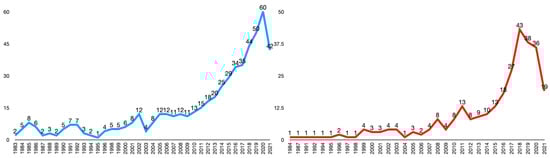 This section is dedicated to obtaining an overview of the dynamic evolution of the research direction between 1982 and 31 October 2021. This clarification is necessary in order to ensure the replication of the research, with explicit reference to the possibility that additional papers will appear after 31 October 2021, due to the prepublication (online version) and postpublication gaps, to which the indexing delays are added. The graphical situation of the dynamic evolution of the number of papers per year is illustrated in Figure 3.
