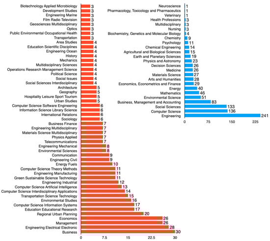 From the perspective of the analysis by scientific categories, in Figure 4 we identified that the following fields in Scopus contained over 100 papers: engineering (241), computer science (136), and social science (133). These were followed by business management and accounting (83) and environmental science (51).