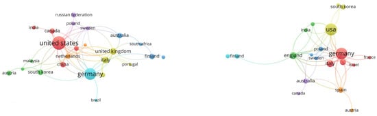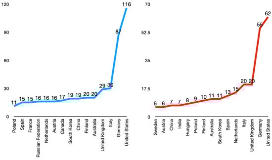 Therefore, from the perspective of analyzing the country of the corresponding author criterion (Figure 5), we noticed that in Scopus, the ranking of the first 15 countries was led by the United States of America with 116 papers, followed by Germany (87), Italy (30), the United Kingdom (29), Australia (20), and Finland (20). With less than 20 papers were: South Korea (19), China (19), Canada (17), Austria (16), the Netherlands (16), the Russian Federation (16), France (15), Spain (15), and Poland (11).