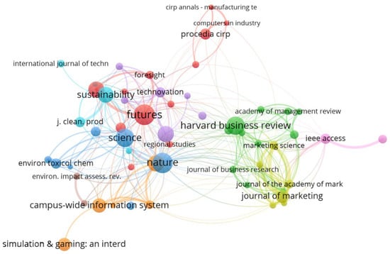 From the perspective of the cocitation analysis of sources, we noticed that the central places of the network of the bibliometric cocitations in Scopus were held by journals, such as: Futures, Nature, Science, Harvard Business Review, Sustainability, and Campus-Wide Information Systems.