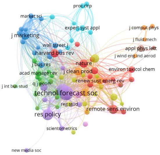 The cocitation analysis, according to the journal criteria, highlighted that the central places of the network of the bibliometric cocitations in WoS were held by Technological Forecasting and Social Change, followed in the second position by Remote Sensing of Environment and Research Policy, and in the third position by Harvard Business Review, Nature, and The Journal of Marketing.