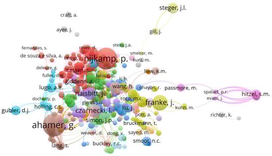 From the perspective of the cocitation analysis of the cocited authors, we noticed that in Figure 8 the central places of the bibliometric network in Scopus were dominated by Ahamer, G. (62); Nijkamp, P. (58); Franke, J. (34); Hakalehto, E. (29); Czarneki, I. (29); Kourtit, K. (28); Wang, Y. (24); Zhang, I. (23); and Naisbitt, J. (18).