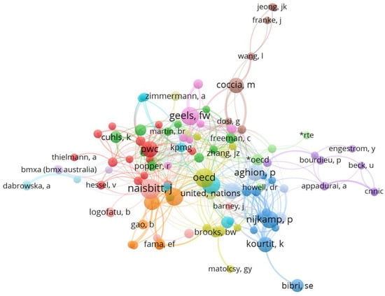 From the perspective of the cocitation analysis of the cocited authors, we noticed that Figure 9 the central places of the bibliometric network in WoS were dominated by Czarnecki, I. (23); Naisbitt, J. (22); OECD (20); Geels, F.V. (19); Porter, M.E. (19); World Bank (18); Nijkamp, P. (18); Acemoglu, D. (16); PWC (16); and Aghion, P. (14).