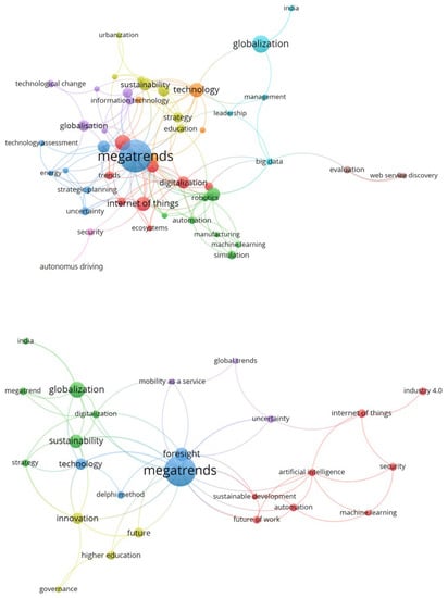 The conclusions of the aforementioned studies [,,,,,,] fully motivate a mapping of the specialized literature assigned to megatrends, which represents an approach with a high degree of originality, being preceded only by a few revisions of the literature in the field. At the same time, the usefulness of this study is proven by the clear highlighting of the main directions and characteristics of the research in this field.