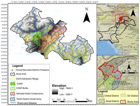 Our study area encompassed 8407 km2 and was located in three districts of Malakand Division (35°29′59.99″ N 72°00′0.00″ E) of KP Province Pakistan. These districts include District Chitral–lower, District Dir–upper, and District Swat (Figure 1). In District Swat, markhor is found in Kalam and Mankiyal valley in the Upper–Swat bounded by Chitral District and GB Province in the north, Indus Kohistan in the east, Bahrain Kohistan in the south, and Dir District in the west. Kumrat valley in District Dir–upper has remained part of the historical range of markhor in the region, bounded by Kalam valley in the east and Shishikoh valley of Chitral in the north-west. In District Chitral–lower, prime areas harboring markhor are the PAs, including the Chitral Gol National Park (CGNP) and two conservancies viz. Tooshi-Sasha Conservancy (TSC) and Gehraite-Golain Conservancy (GGC). CGNP encompasses an area of 77.5 km2 and is situated at a distance of 3 km west of Chitral town. TSC comprises an area of 200 km2 and is located to the northeast of Chitral town on either side of Garam Chashma stream, a tributary of River Chitral. GGC encompasses an area of 950 km2, extending from south to northeast of Chitral town along the left bank of River Chitral.