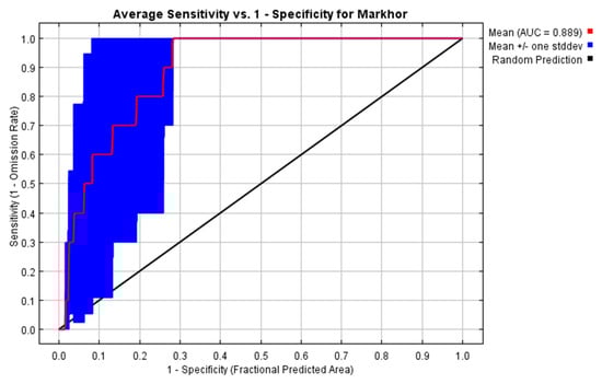 The data obtained in the current study were processed and analyzed using MaxEnt 3.3.3k [] to predict suitable habitats for markhor in the study area. Based on the ecological niche theory, the MaxEnt model relies on information from species presence data to investigate the possible distribution of a target species within a study area []. The MaxEnt software was developed to assess and evaluate suitable habitats for target species with good predictive power [] and is amongst the most advanced and promising tools for SDMs [,]. Due to its higher predictive accuracy, MaxEnt has surpassed other methods used for the purposes mentioned above [,].