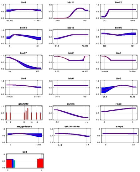 Response curves of predictors for markkhor occurrence in the study area. Note: The red curves show the mean response of the five replicate MaxEnt runs, while the mean +/− one standard deviation is shown by blue (two shades for categorical variables). Predicted value of habitat suitibality (logistic output) is shown on the Y-axis while the range of the environmental predictors is shown on the X-axis.