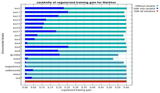 Global land cover (glc2000) contributed 35.4% in habitat selection of markhor (Figure 3, Table 2). Other variables with the highest contribution in habitat selection of markhor were bio15 (15%), bio6 (12.7%), rivers (10.3%), bio2 (4.3%), bio11 (4.2%), and bio12 (4%). The least contributing variable were ruggedness (0.4%), bio4 (0.5%), soil (1%), bio17 (1.1%), bio14 (1.2%), bio8 (1.4%), bio16 (2%), road (2.3%), and settlements (2.65%). Two variables, bio1 and slope, did not contribute to markhor’s habitat prediction in our study area (Figure 3, Table 2).