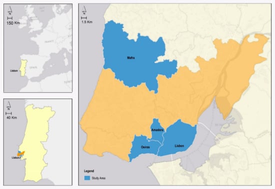 Location of the study area: the four municipalities), Amadora, Lisbon, Mafra, and Oeiras, from the Region of Lisbon (Greater Lisbon, NUT III—2002).
