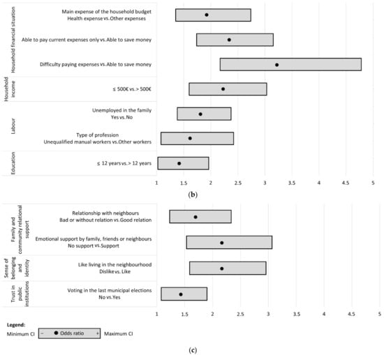 This study identified several neighbourhood environmental characteristics that represent potential risk to poor mental health (Figure 2). The highest significant odds ratios (≥2.00; p-value ≤ 0.05) were found in the socioeconomic environment. Individuals that reported difficulty paying expenses, and were only able to pay current expenses, had a significantly higher probability of having poor mental health than those that reported the ability to save money (odds ratio of 3.22 and 2.34; 95%CI 2.17–4.78 and 1.74–3.16, p-value ≥ 0.05, respectively). The individuals with lower household income (≤500 €) also had a higher significant risk of having poor mental health (odds ratio of 2.23; 95%CI 1.60–3.03, p-value ≥ 0.05). In this dimension, other characteristics regarding labour (unemployment in the family/type of profession) and education also presented risk to mental health.