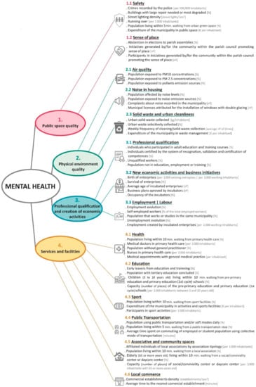 Neighbourhood environmental conditions that enable the population’s mental health are presented in Table 4 and Figure 3. Four CDF were identified: 1. public space quality, 2. physical environment quality, 3. professional qualification and creation of economic activities, and 4. services and facilities. The following sections describe the CDF and respective AC, and identify the indicators that inform evaluation of each AC. All of the CDF, AC and indicators informing the evaluation of each AC are presented in Table 4 and Figure 3.