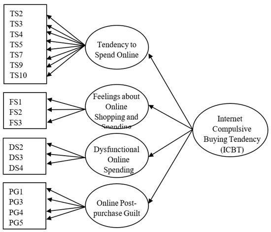 We referred to the scales developed by related studies (e.g., Faber and O’Guinn [7]; Valence et al. [32]; Edwards [33]) and screened the items to first develop an original scale that consisted of 31 items. Following the scale-development process, we collected data with two rounds, conducted statistical analyses, and tested the data by using both EFA and CFA to determine the reliability and validity of each construct. The results indicated a high level of reliability and validity of all the indicators (internal consistency, CR, and AVE). After poor loading of items were excluded, we obtained the final scale, which consisted of 18 items. These items were grouped into four sub-constructs: the tendency to spend online, feelings about online shopping and spending, dysfunctional online spending, and online post-purchase guilt. The final research model is shown as Figure 2.