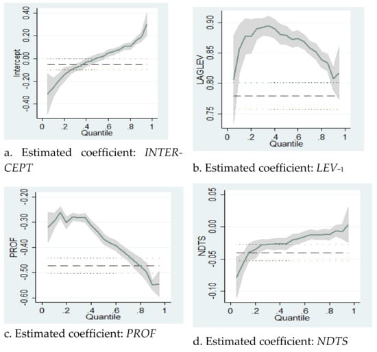 Table 5 also reports the results of the homogeneity test and related p values for the parity of quantile parameters when we test the distinct pairs of quantiles: (0.1;0.9), (0.2;0.8), (0.3;0.7), and (0.4;0.6). All F-tests disallowed the null hypothesis, which affirms that all coefficients are homogeneous at the 99% confidence level for all F-tests. Thus, the effects of the independent variables vary across the different quantiles of the debt ratio allocation. These tests affirm that the effect of firm-specific characteristics varies across different quantiles.