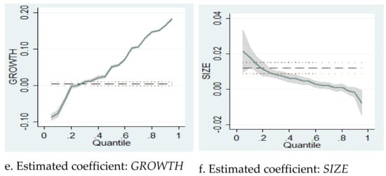 Second, the OLS estimation indicates that GROWTH has a positive and significant relationship with leverage. That is, firms use more debt when they have higher growth opportunities because investment opportunities require strong financing demands. This result corroborates the results in [7,22]. For asymmetric information on investment opportunities, the POT predicts that firms prefer using debt over equity as growth opportunity increases. However, the quantile regression results do not exhibit similar signs for all part distributions. The low quantiles (0.1, 0.2) reveal a negative effect of growth opportunity on leverage. These results suggest a relationship between less cash flow that is free and greater investment opportunities of a firm with low leverage. In this case, firms are less subject to disciplinary supervision by managers, leading to an inverse effect of investment opportunities on debt. Ref. [10] explain that tangible assets present collateral assets, but intangible assets are inverse. When firms have a higher proportion of intangible assets in total assets (such as growth opportunity), they face more significant difficulties in borrowing debt. Contrariwise, in higher quantiles, the coefficients of growth opportunity are positive and significant. The positive effect of growth opportunity on leverage is more substantial when the debt ratios move to higher levels. Therefore, in higher quantiles, the positive relationship between leverage and growth opportunity offers more support for the POT prediction.
