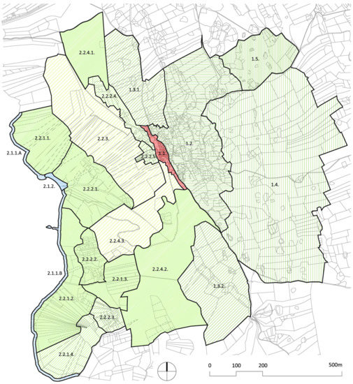 The following value categories have been selected for the evaluation of landscape units: evident (archaeological, architectural, urban and environmental), aesthetic, documentary, cultural, symbolic, socio-economic, natural and ecological. The cumulative value of all these values is expressed as cultural significance, with the cultural significance (degree of value) proportional to the degree of sensitivity to changes in the landscape [32,33].