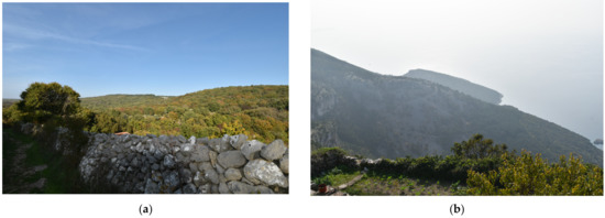 The historic agrarian valley has a number of “ponikve” (sinkholes, circular recesses with steep sides, mostly in the form of a funnel). Today, it has natural plant cover on terraced surfaces, bounded by a small network of dry stone walls, with auxiliary buildings and a network of field paths. The terraces were once cultivated with traditional cultures: olives, vines and grains; today, they are left to the succession of macchia. Due to the wild vegetation and a lack of maintenance of the agricultural land, the visual pattern of dry stone walls has been lost (Figure 3a).