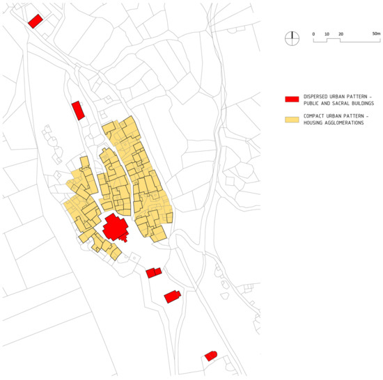 The dispersed urban pattern is composed by public, sacral and communal buildings and public spaces in the northern and southern parts of the urban core.