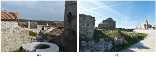 Lubenice public spaces comprise an access square in the southern part of the urban core, two main streets leading from the square towards the northern part of the settlement (the western street leading towards the former school building and the eastern towards the town cemetery) and a passage through the central housing agglomeration. The access square has an irregular layout, with a slight fall towards the south, and is paved with broken stone slabs laid in cement mortar, without any elements of surface drainage. A communal water cistern with a stone crown and edged with stone walls forms an integral part of the square (Figure 14).