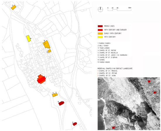 Chapels in the contact landscape, the bell tower and the chapel of St. Antun have been retained in their original condition. The parish church has preserved layers of historical alterations, while the school building, clergy house and chapel of St. Nedjelja have been partially altered (Figure 7).