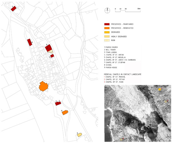 All public and sacral buildings in the urban and peri-urban area have been maintained and preserved (except for the chapel of St. Nedjelja and the southern part of the clergy house), while the medieval chapels in the contact landscape have not been maintained (the chapel of St. Mihovil is dilapidated/partially damaged and in need of restoration, while the chapels of St. Petar and St. Ivan are dilapidated).