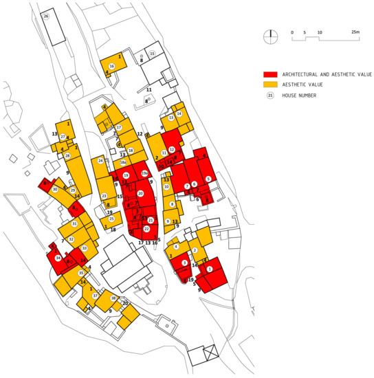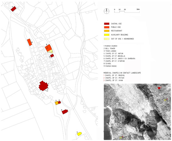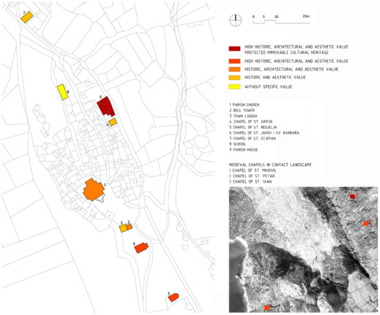 The evaluation of architectural elements was carried out on the basis of several criteria: historical/documentary, archaeological, architectural, urban and environmental aesthetic value. According to the above criteria, in the category of public and sacral buildings, two medieval chapels in the southern part of the urban core (St. Antun and St. Nedjelja), one chapel in the contact landscape (St. Mihovil) and the clergy house complex are of high historical, architectural and environmental aesthetic value and thus have a high degree of sensitivity to change. The parish church and bell tower have historical, architectural, environmental aesthetic and symbolic value; the medieval chapels of St. Petar and St. Ivan have historical, architectural and environmental aesthetic value, while the town loggia and the chapels of St. Jakov and St. Stjepan have only environmental aesthetic value (Figure 16).