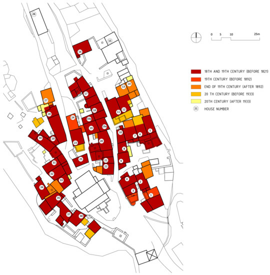 The settlement had the status of a commune until the end of the 15th century, when it fell under the jurisdiction of the town of Cres [28]. The general progress of development on the island of Cres in the 18th century and at the end of the 19th century resulted in an increase in the population and the further expansion of the settlement beyond the fortified perimeter towards the north and south. At the end of the 19th century, a second floor had been constructed on most houses within the town center.
