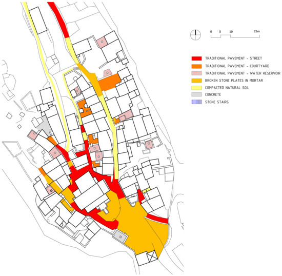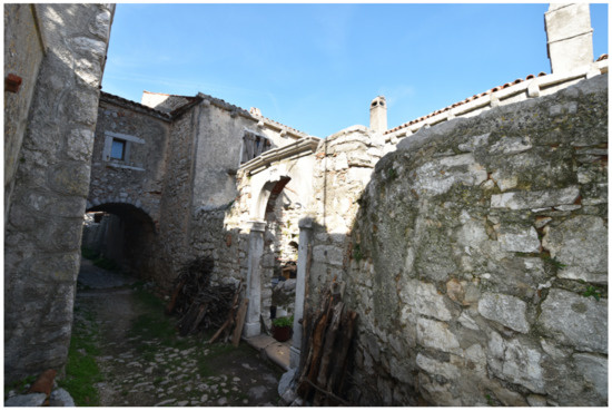 The streets are characterized by the partly preserved original pavement, with broken or partially carved stone elements laid vertically and without mortar (smaller, irregular stones used for streets and larger, shaped stones for internal courtyards and terraces of external water cisterns) (Figure 15).