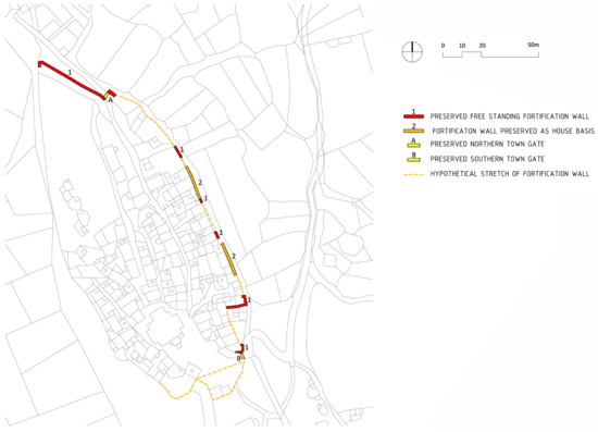 The architectural logic of the stretches of the fortification system on the northern, eastern and southern perimeter of the medieval town suggests the existence of town walls in the southern part of the urban core; for their precise determination and possible presentation, additional archaeological research would be needed (Figure 12 and Figure 13).