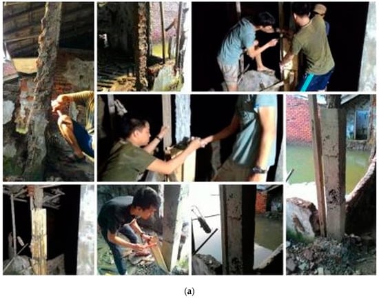 This research retrofitted two broken columns marked by red rectangles, as shown in Figure 6a. Those two columns were used to pin the broken masonry wall and observed that the concrete’s cover as well as most parts of the columns were peeled off, while the steel reinforcement was corroded. After some months, almost half of the left column collapsed, as shown by Figure 6b.