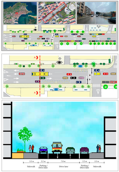 Given the lack of proposals for spatial areas other than American ones, we propose an example of an adaptation of these proposals to the European area for a real typical street. This urban design proposal can be applied to other streets with a similar profile, within the same street category. Considering that in Europe over 680 cities have between 50,000 and 250,000 inhabitants [22], an urban street in a medium-sized Spanish city has been selected. Santander is the capital of the northern region of Cantabria, and a main urban centre of an emerging metropolitan area with a total population of 173,375 inhabitants [71]. It is basically a compact and mixed city with a mainly service-based economy. Regarding urban mobility (including commuting), most citizens use private motorised transport (48%), or walk (42%) [72].