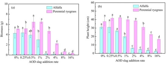 Effects of AOD slag fertilization on biomass and plant height of the alfalfa and perennial ryegrass seedlings after germination for 30 days; (a) biomass, (b) plant height. The error bars indicate standard deviation and lower case letters show significance at p < 0.05 according to Duncan’s test.