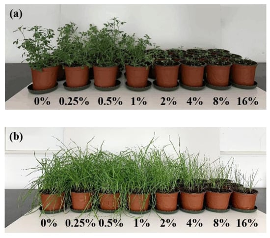 The alfalfa and perennial ryegrass seeds used in this work were purchased from a seed company in Shandong, China, with germination rates of more than 90%. The pregermination of the alfalfa and perennial ryegrass seeds were conducted using 2% H2O2 at 25 °C for 24 h under dark conditions in an incubator before sowing. After pregermination, the obtained seeds were washed thoroughly with deionized water, and then thirty uniform seeds were sown in each plastic pot. For reliability, three replicate pot experiments were performed for each addition rate. The sowed alfalfa and perennial ryegrass seeds were incubated in a growth chamber having a day/night cycle of 16/8 h and day/night temperature of 25/20 °C. Pots were watered daily with a quantity of deionized water to maintain the water holding capacity of 60%. The alfalfa and perennial ryegrass seedlings were thinned to 10 per pot on the 7th day after emergence []. The alfalfa and perennial ryegrass seedlings were harvested at 30 days after sowing, and then the morpho-physiological and biochemical parameters were determined.