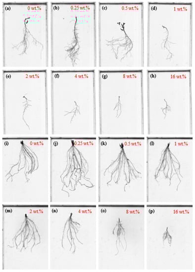 Root morphology of the alfalfa and perennial ryegrass seedlings after germination for 30 days; (a–h) alfalfa, (i–p) perennial ryegrass.