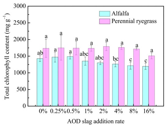 Effects of AOD slag fertilization on total chlorophyll content of the alfalfa and perennial ryegrass seedlings after germination for 30 days. The error bars indicate standard deviation and lowercase letters show significance at p < 0.05 according to Duncan’s test.