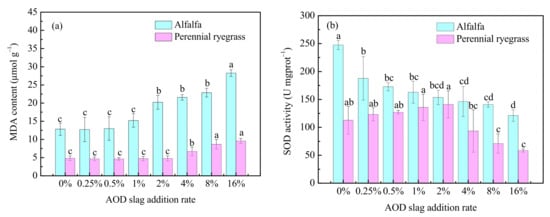 The heavy metal in plants generates reactive oxygen species (ROS), resulting in the damage of the membrane lipid and plant cell. The extent of ROS damage to membrane lipid can be estimated by the MDA content of the plant []. As shown in Figure 5a, compared with the control, the MDA content of the alfalfa almost did not change when the addition rate was lower than 0.5 wt.%. The continuous increase of MDA content of the alfalfa was observed when the addition rate was higher than 0.5 wt.%. As for perennial ryegrass, the obvious enhancement of the MDA content was detected when the addition rate was higher than 2 wt.%. The MDA content of the alfalfa and perennial ryegrass seedlings increased by 120.5% and 97.3%, respectively, at the addition rate of 16 wt.%. The obtained results indicated that the low rate of AOD slag addition to soil induced little oxidative stress to the alfalfa and perennial ryegrass seedlings. The phytotoxicity caused by the AOD slag fertilization could be observed when the addition rate was high. This may be attributed to the large leaching of Cr from the AOD slag.