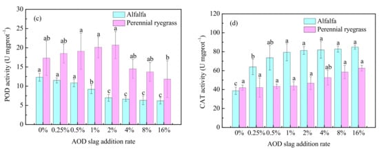 Effects of AOD slag fertilization on MDA content and antioxidant enzyme activities of the alfalfa and perennial ryegrass seedlings after germination for 30 days. (a) MDA content, (b) SOD activity, (c) POD activity, (d) CAT activity. The error bars indicate standard deviation and lower case letters show significance at p < 0.05 according to Duncan’s test.