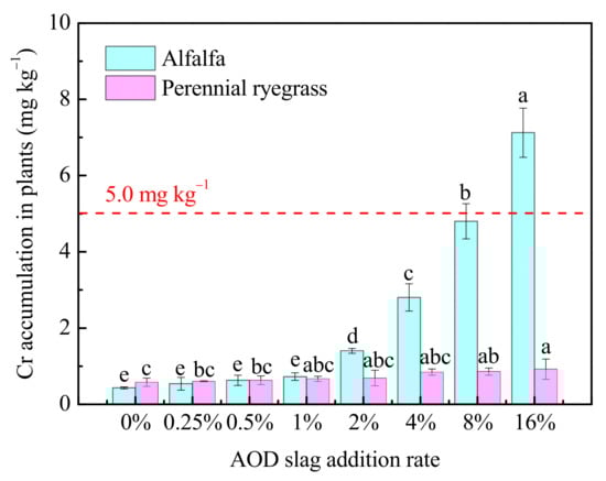 Effects of AOD slag fertilization on chromium accumulation in the alfalfa and perennial ryegrass seedlings after germination for 30 days. The error bars indicate standard deviation and lower case letters show significance at p < 0.05 according to Duncan’s test.
