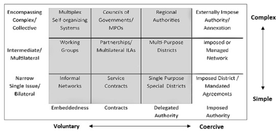 The second framework that can be applied to classify institutions is Richard Feiock’s taxonomy of “integration mechanisms”, which was developed following his observations of metropolitan institutions throughout the United States. While there are undoubtedly many differences in the political systems of the United States and Australia, both countries are highly developed market economies that apply indirect democracy through a Federal system where a significant amount of authority is devolved to State and local tiers [38].