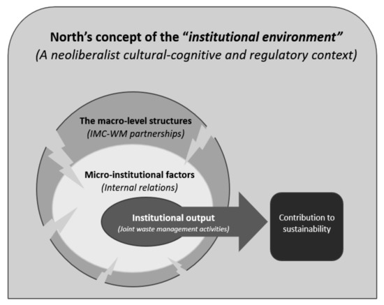 Although the term institution is often used synonymously with the term organisation, there are distinct differences in the sociological implications of these concepts. For example, institutions are characterised by procedures that end up manifesting as the “rules of the game” [34], or grounded in the “humanly devised constraints that shape human action” [35]. Davis and North [36] introduced the concepts of the ‘institutional environment’ and the ‘institutional arrangement’ to understand the cooperation between institutions. The institutional environment refers to the broader political, social and legal norms of the economic system within which the institution operates. The institutional arrangement refers to the norms and behaviours that are implicitly or explicitly agreed to by the participants of the institution itself.