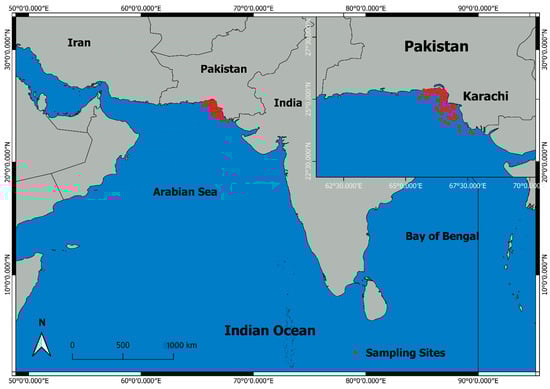 Map indicating study area in Pakistani coastline with the location of sampling sites.