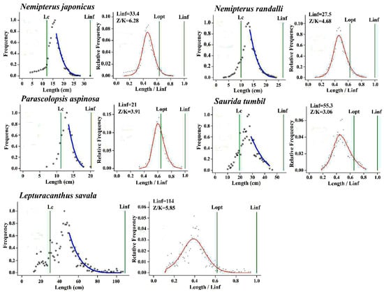 Graphical results of LBB method for five commercially captured marine species from marine water of Pakistan. Lc signifies the length at first capture, Linf indicates the species’ limit of body length, and Lopt represents the maximum sustainable catch length.