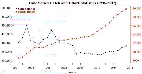 Time series marine catch (tons) and effort (operational fishing boats) from 1991–2017 in Pakistan [46].